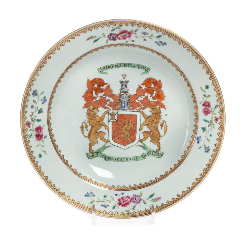 centered with the coat-of-arms of Lauder within the motto Turris Prudentia Custos/ Ut Migraturus Habita, the iron red and gilt decorated borders enclosing floral sprays.
