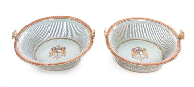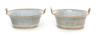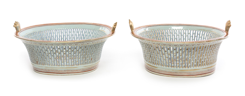 A Pair of Chinese Export Porcelain Armorial Reticulated Oval Baskets