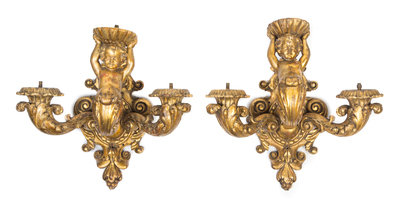 each having a cartouche form backplate issuing the candle arms, the central candle arm carved to show a putto supporting a shell.