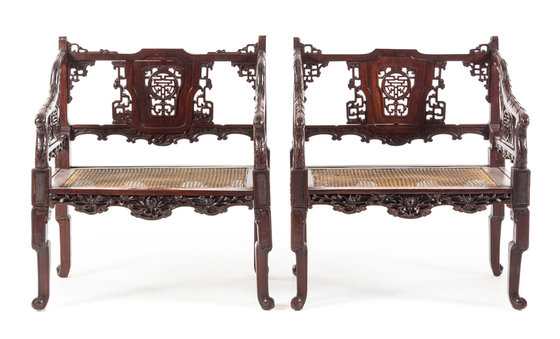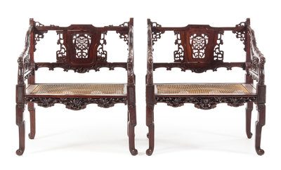 each having a pierce carved back and arms above the caned seat, raised on shaped legs ending in scrolled toes.