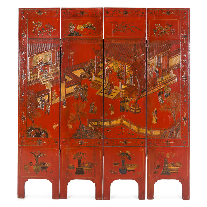 one side depicting various figures in both interior settings and a courtyard over panels depicting various floral arrangements, the other side depicting birds among flowering branches.