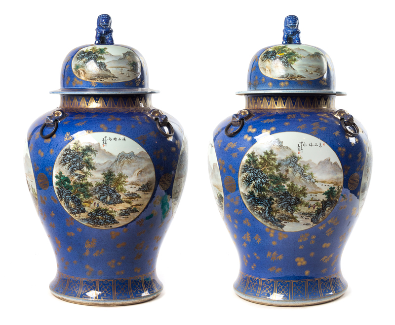 each of baluster form with mask form ring handles, the lids with foo dog finials, each decorated with panels depicting landscapes.