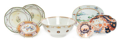 comprising two oblong platters, a soup plate, two dessert plates, a punch bowl and a tea caddy, together with a Davenport bone china dish and an English Imari style navette shaped dish.