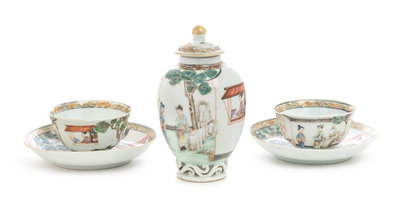 together with a tea caddy, each depicting a continuous band of figures engaged in various pursuits.