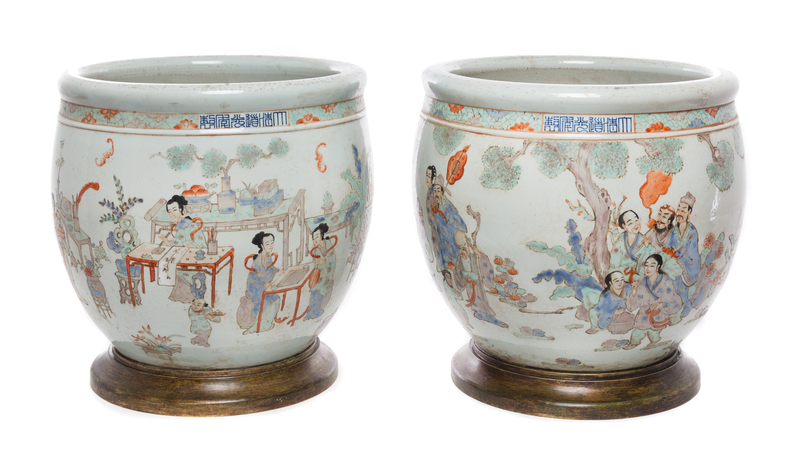 A Pair of Chinese Bronze Mounted Porcelain Jardinieres