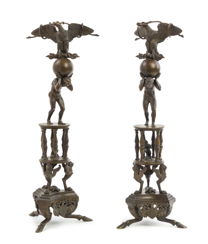 each cast to show a nude man over a circular architectural element enclosing Pan and supporting a spreadwing eagle perched upon an orb and clutching a writhing snake, the whole raised on winged lion monoped supports over a tripartite base ending in hoof feet.