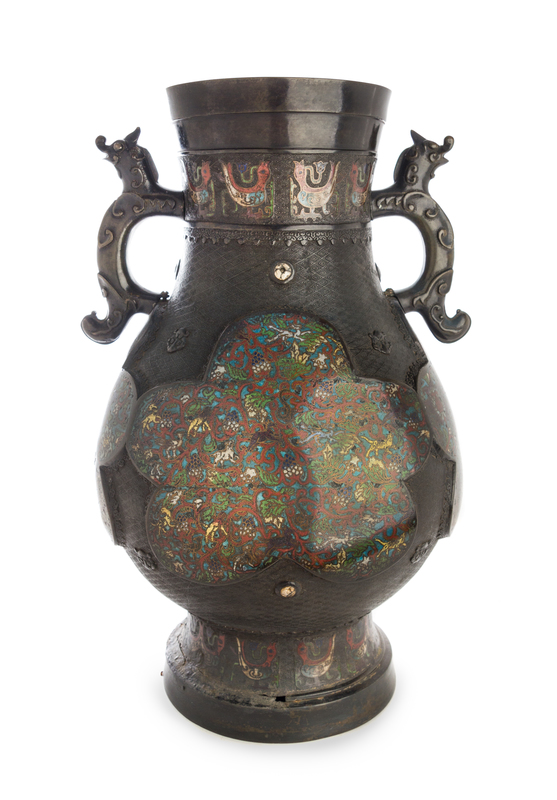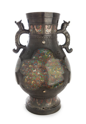 of baluster form with stylized animal form handles, with allover cloisonne enameled decoration.