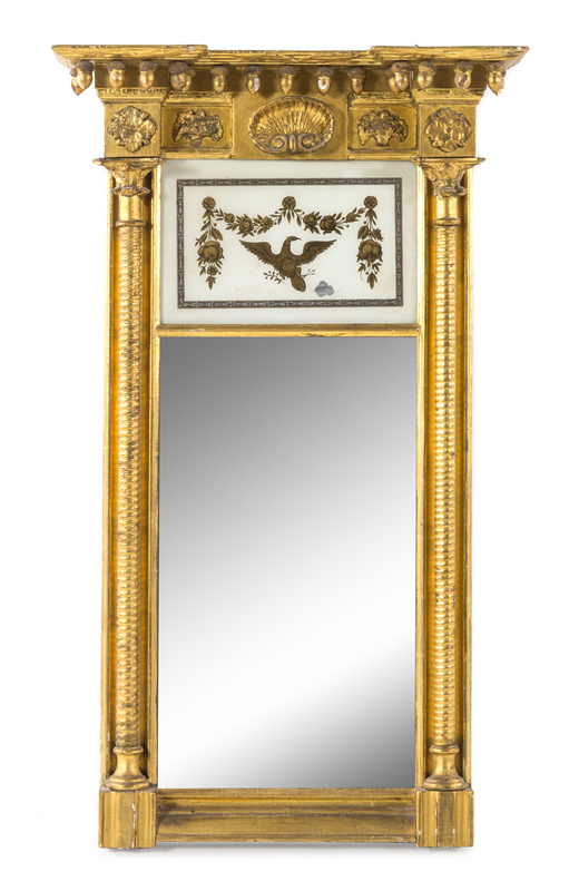 having a molded cornice of breakfront outline with acorn drop finials above the eglomise panel depicting an eagle clutching an olive branch and arrows under floral garlands and the vertical rectangular mirror plate, all flanked by ring turned columnar pilasters.