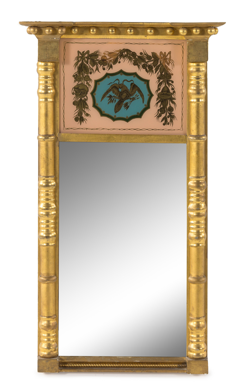 having a molded projecting cornice with spherules above the eglomise panel painted to show a spreadwing eagle clutching an olive branch and arrows under a floral and fruit-filled garland and the vertical rectangular mirror plate, all flanked by turned cylindrical pilasters.