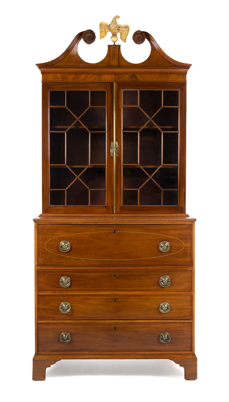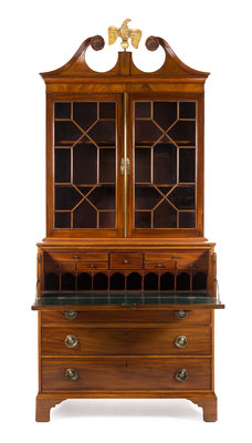 in two parts, the superstructure having a swan neck pediment centered by a giltwood spreadwing eagle finial above the two glazed doors with mullions opening to a shelved interior, the base having a fall-front opening to a leather-inset writing surface and a fitted interior, further fitted with three graduated long drawers, raised on bracket feet.