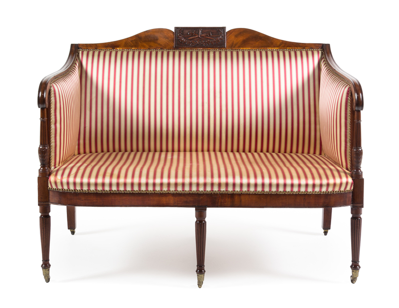 the serpentine crest rail centered with a rectangular tablet carved to show a trophy among ribbon tied laurel branches in relief above the padded back, sides, and stuffover seat, the arms set on reeded columnar supports carved to show lattice and floral decoration, raised on reeded cylindrical tapering legs ending in brass caps and casters.
