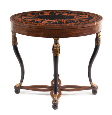 in the Empire taste, raised on female monoped supports ending in hoof feet over ball feet, the legs joined by an X-form stretcher.