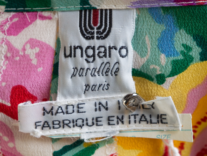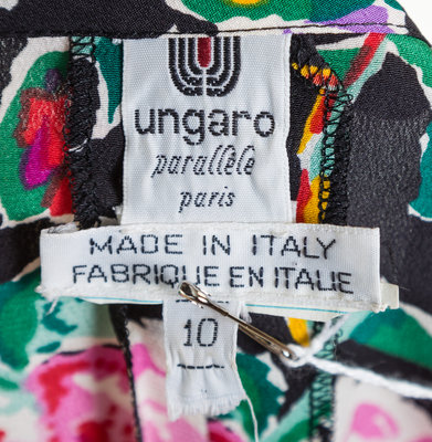 with short sleeves, a padded and pleated shoulder and a self tie at the side waist.Each labeled: Ungaro Parallele.