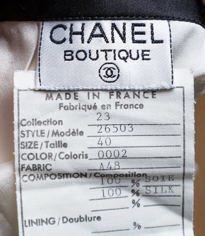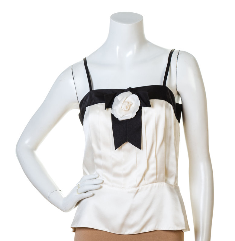 Collection 23,with spaghetti straps, front pleats, a fitted waist, a black bow and camellia at the center neckline with a back hidden button closure.Labeled: Chanel.