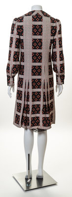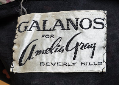midi-length with long gathered sleeves, an exaggerated pointed collar, slip pockets, a front zip closure and a drop waisted skirt with pleat detailing.Labeled: Galanos for Amelia Gray Beverly Hills.