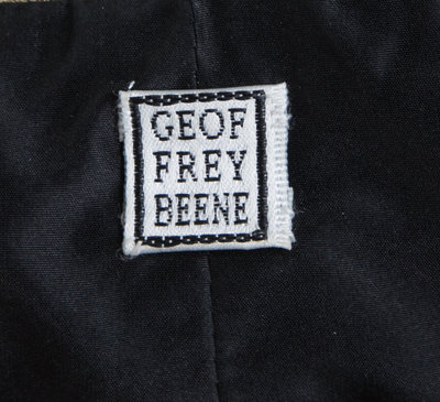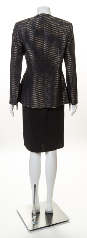 comprised of a jacket with a rounded collar, faux flap chest pockets, pleating at the hip and decorative goldtone button front closure; together with a black straight skirt with a center seam and a side zip closure.Each labeled: Geoffrey Beene.