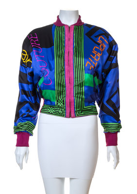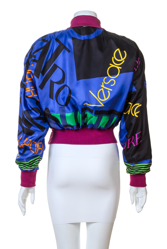 1980's-1990's, with elastic knit at the collar, cuffs, and back waist, a zip front closure, side zip pockets and a figural print design on the back; reversible with a brightly colored interior silk lining and two welt slip pockets.Labeled: Gianni Versace.