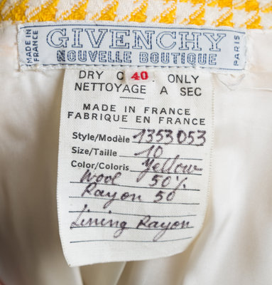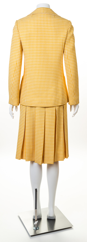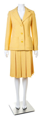 comprised of a jacket with a notched collar, front patch pockets and yellow front button closure; together with a matching box pleat skirt with a side zip closure. Tape number 1353053-40-35486/63.Each labeled: Givenchy Nouvelle Boutique.