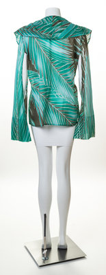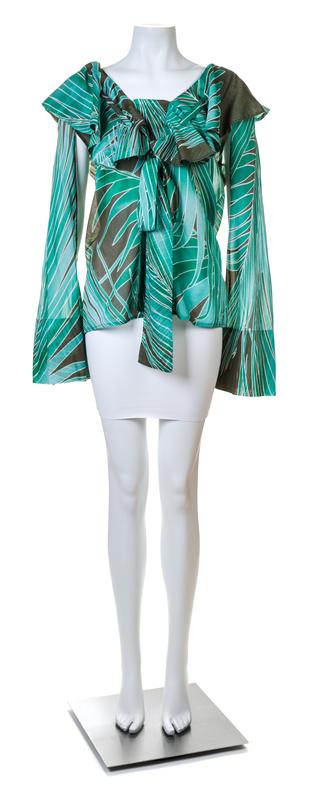 pullover with long slit funnel sleeves and a ruffled shawl collar neckline with a woven attached self tie bow. Labeled: Gucci.