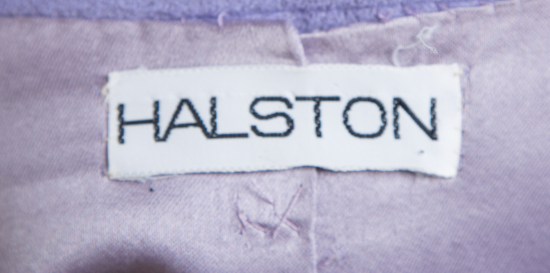 with a notched collar, patch pockets, a removable matching self tie belt and fully lined in lavender silk.Labeled: Halston.