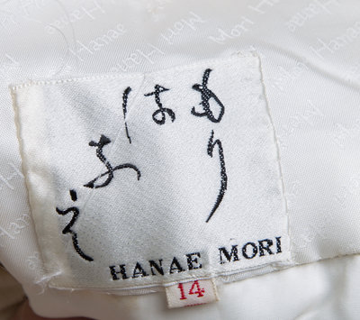 with a rounded neckline, an interior straight sheath dress with a back zip closure, an attached overlay with a front split hem and a back zip closure.Labeled: Hanae Mori.