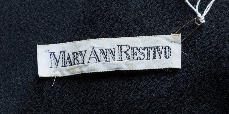 with a notched lapel, a chest patch pocket with ribbon detail, matching ribbon detail on the plain cuff, three button front closure, a fitted waist, a pleated pant with side slip pockets and a front zip closure; together with a removable slide belt.Labeled: Mary Ann Restivo.
