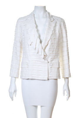 with a notched lapel, two front jetted flap pockets, textured applique of white cotton twill fabric strips and a single interior button and metal hook closure.Labeled: Maison Margiela.