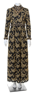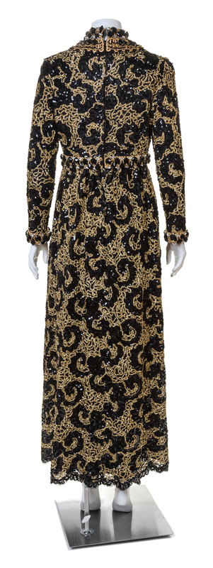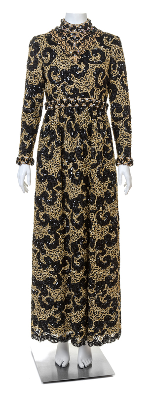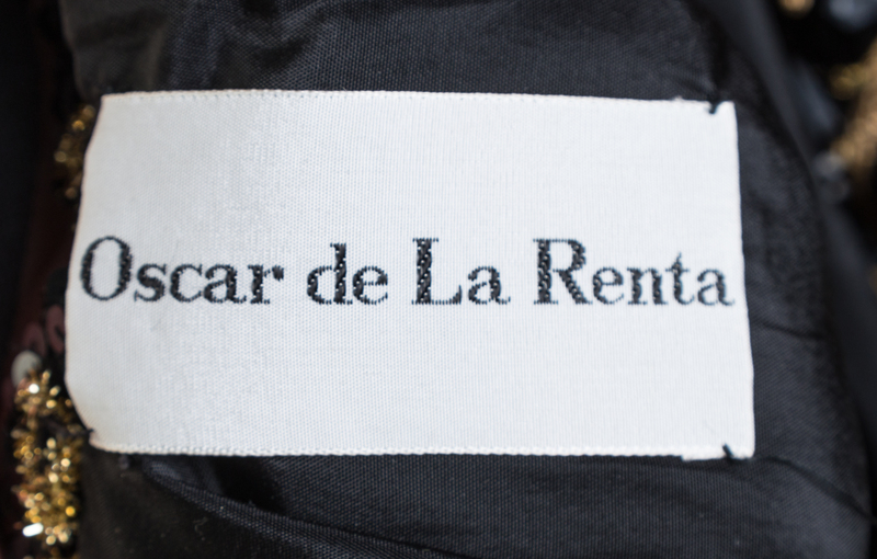with long sleeves, a beaded and faux jeweled bib neckline, black sequin and gold tinsel embellishment throughout, a gathered waist with an attached faux jewel belt, a matching cuff, a back zip closure and fully lined.Labeled: Oscar de la Renta.