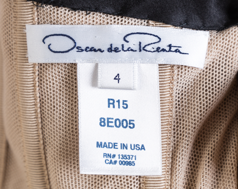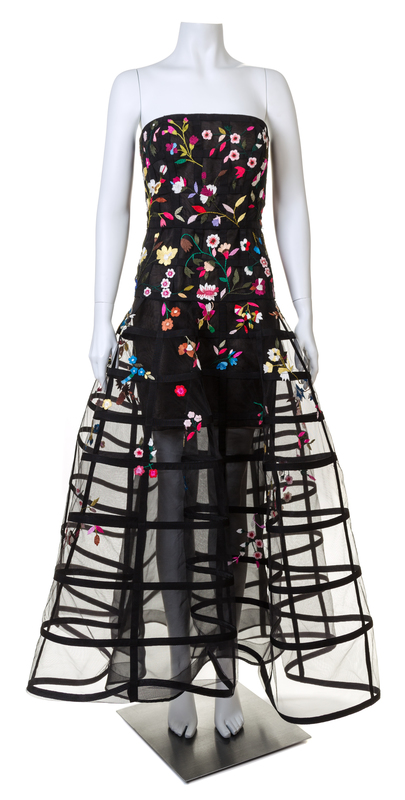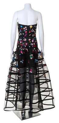 2015,strapless with a fitted bodice, an interior corset, a dramatic sheer birdcage skirt and a back zip closure.Labeled: Oscar de la Renta.
