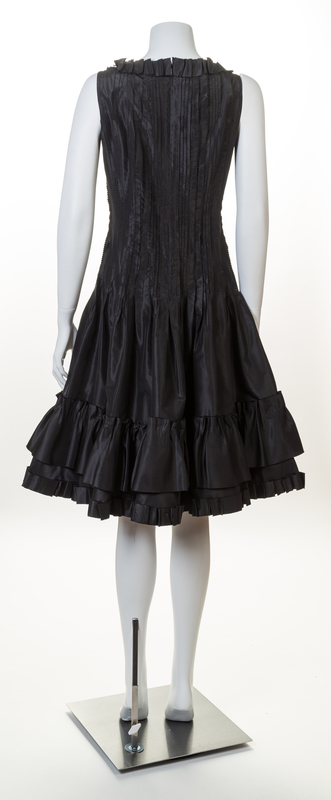 Fall 2006,sleevless with a scoop neckline with ruffle and bow embellishment, decorative pleating throughout the fitted bodice, a drop waist skirt with a tiered ruffle hem and a back zip closure.Labeled: Oscar de la Renta.