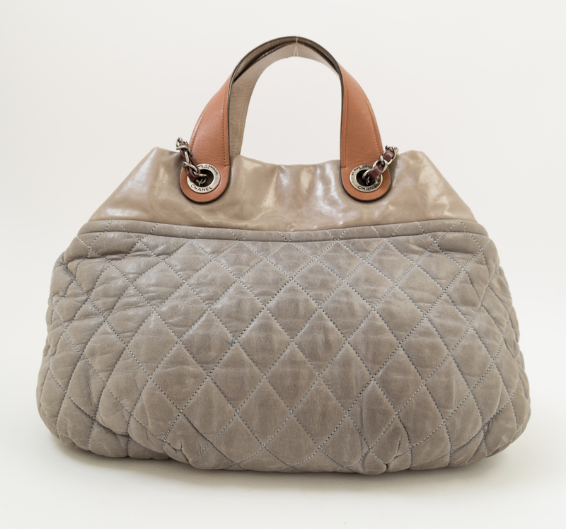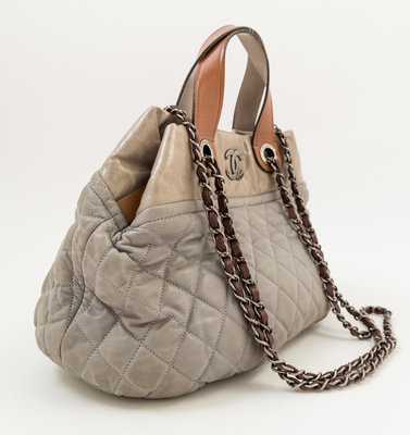 2011,with leather top handles, antiqued silvertone hardware, burgundy leather woven chain straps, an interior top magnetic closure and two interior slip pockets and one interior zip pocket. Together with a dustbag. Stamped: Chanel.