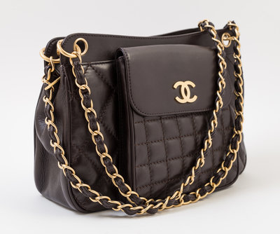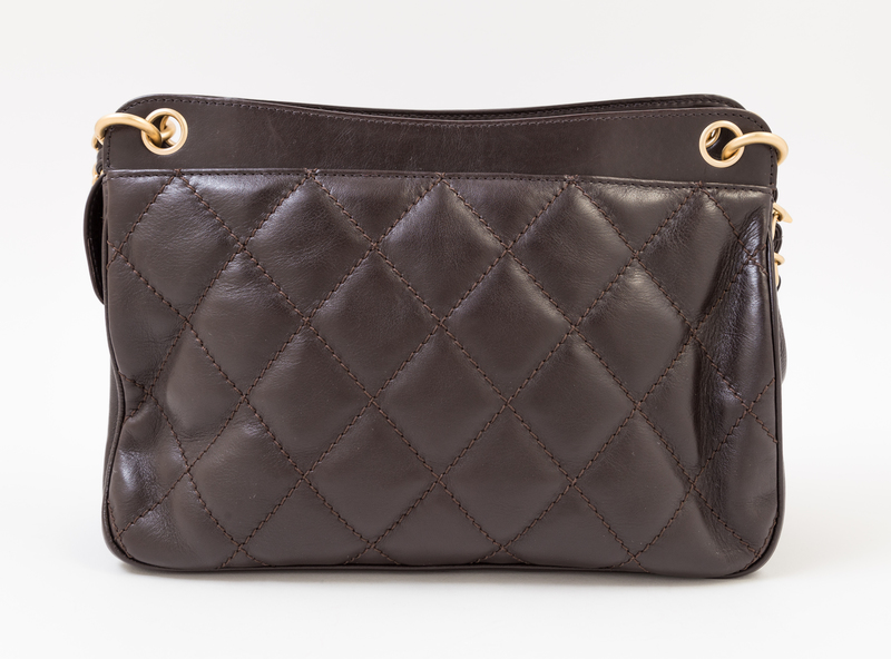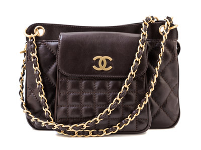 2003-2004,with double leather woven chain straps, brushed goldtone hardware, an exposed top zip closure, an exterior front square quilted flap pocket and one interior zip pocket. Together with a dustbag.Stamped: Chanel.