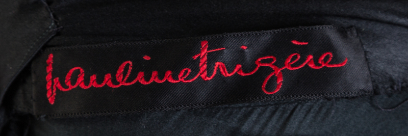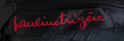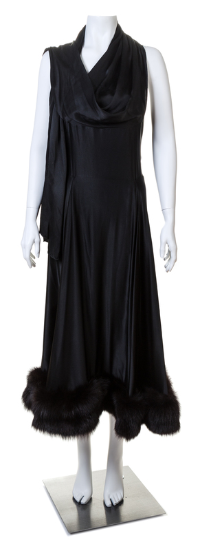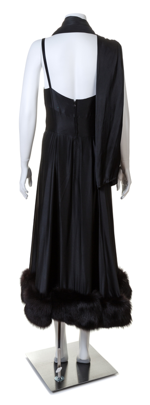 sleeveless with a draped neckline, a wrap around attached scarf, a fitted bodice, a fox trimmed hem and a back zip closure.Labeled: Pauline Trigere.