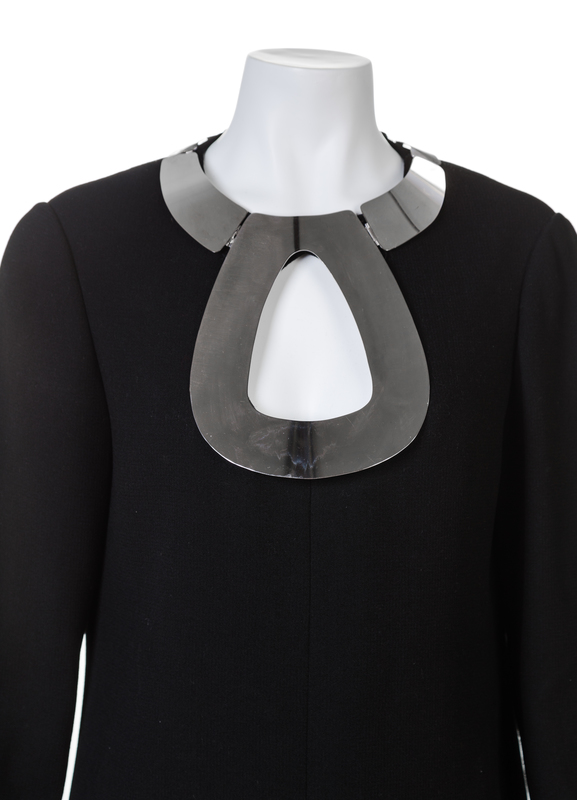 with long sleeves, a fitted silhouette, a silver metal hardware articluated collar, a keyhole cutout on the front center of the chest, matching attached cuff hardware, a center front split hem and a back metal zip closure.Labeled: Pierre Cardin.