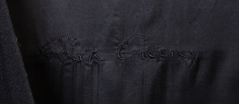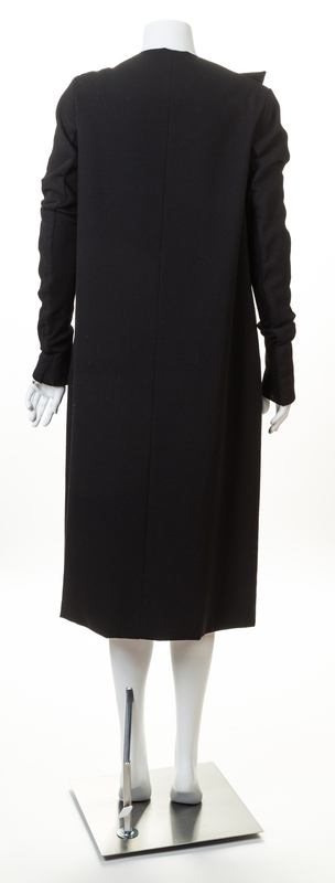 Fall/Winter 2009,with knit panel insert long sleeves, a bateau neckline, a wrap front shoulder two snap closure, two exterior slip pockets and two interior pockets.Labeled: Rick Owens.