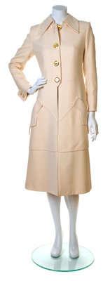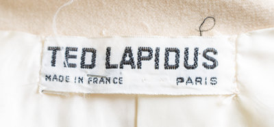 with a pointed collar, tonal stitching, decorative logo goldtone partial front button closure, decorative flap pockets, an inverted back pleat and an attached half belt.Labeled: Ted Lapidus Paris.
