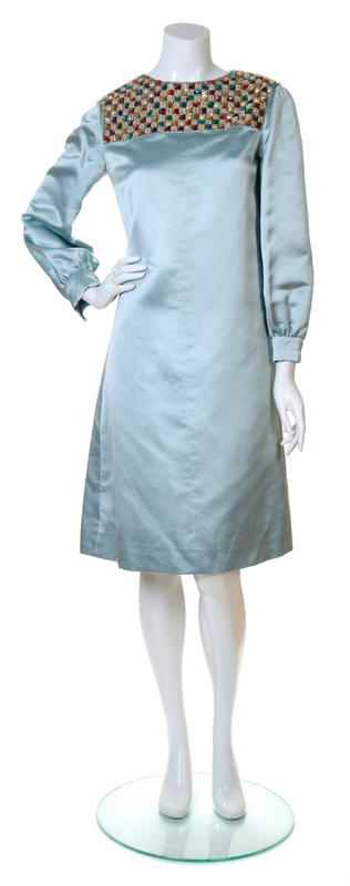 with long cuffed sleeves, a round neckline with a sequin and beaded embellished front and back top bodice, a straight silhouette and a back zip closure.Labeled: Teal Traina.
