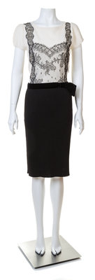 with short sleeves, a rounded neckline, decorative lace on the front bodice, a straight midi-length skirt, a side zip closure and an attached black velvet belt with a half bow.Labeled: Valentino.
