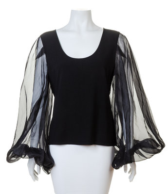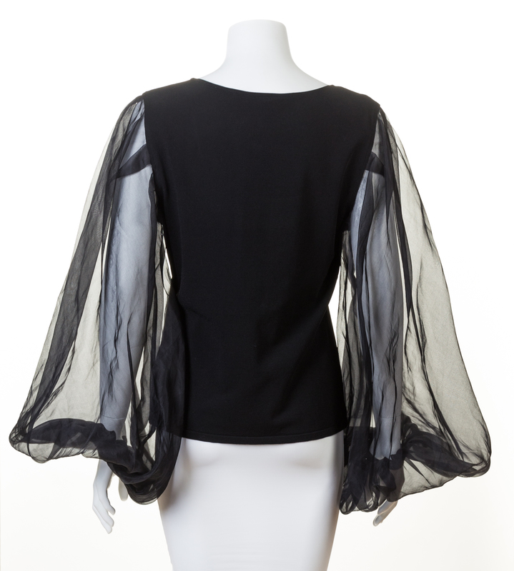 with a scoop neckline and voluminous gathered at the cuff black silk sheer sleeves.Labeled: Valentino.