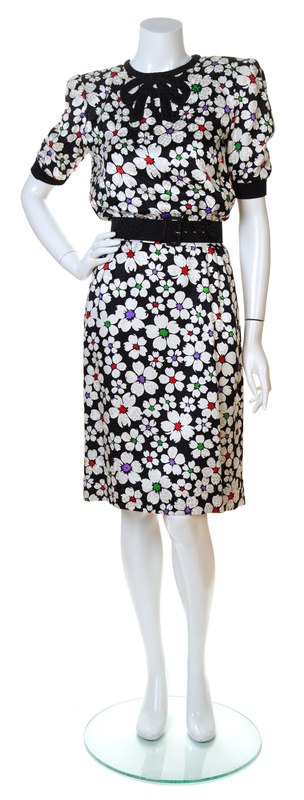 with short gathered cuff sleeves, a round neckline with an embroidered black bow, a fitted waist, side slip pockets and a back zip and button closure; together with a matching black silk belt.Attributed to: Valentino; belt stamped: Valentino.