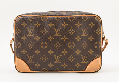with vachetta leather trim, one exterior front pocket, one interior zip pocket, goldtone hardware, single zip top closure, with a adjustable flat leather shoulder strap. Together with dustbag and box. Stamped: Louis Vuitton.