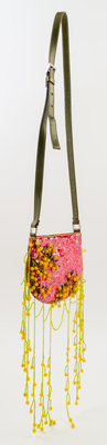 with an adjustable green leather shoulder strap, silvertone hardware, a magnetic top closure, decorative beaded fringe and a red silk interior. Together with a dustbag.Stamped: Valentino Garavani.