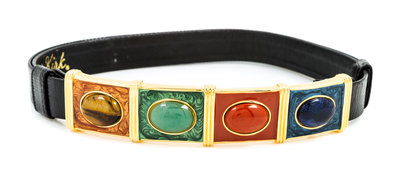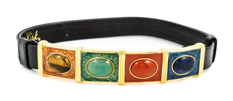with an adjustable slide design and a goldtone and multicolor enamel buckle with hook closure.Stamped: Alexis Kirk.