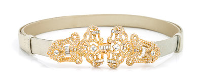 adjustable with a goldtone and rhinestone clasp buckle.Stamped: Judith Leiber.