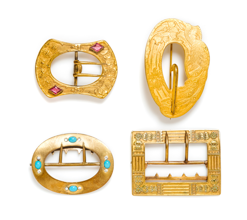 the first: gilt bronze two pink stones; the second: goldtone with a peacock motif; the third: brass with blue stones; the fourth: a gilt bronze square with a flower pattern at the corners.Unstamped.