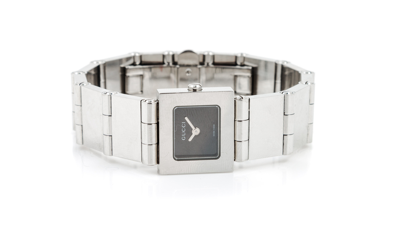 with a square face and a push button deployment clasp. Swiss made and water resistant.Stamped: Gucci.