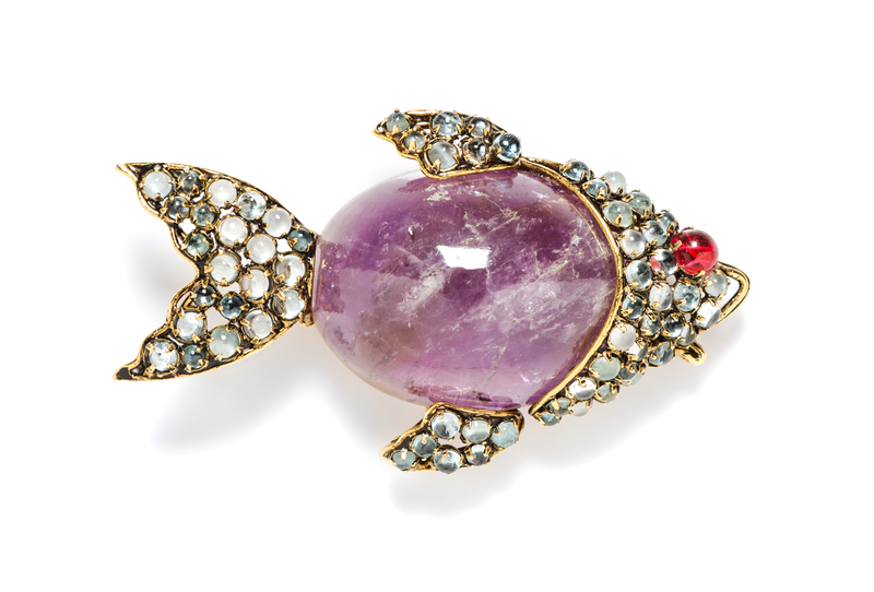 An Iradj Moini Amethyst, Quartz and Glass Fish Brooch,