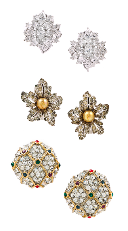 the first: circular with clear and multicolored rhinestones; the second: clear pear shaped rhinestones; the third: Jomaz floral yellow rhinestones and center faux pearl. Two unstamped.Third stamped: Jomaz.