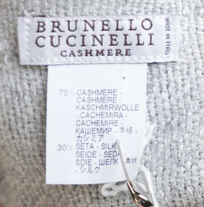 one side with goldtone metallic and sequin embellishment with fringed edge. Labeled: Brunello Cucinelli Cashmere.