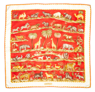 red center with jungle, arctic, desert, tundra pattern with a cream trim. Labeled within the print: Salvatore Ferragamo.